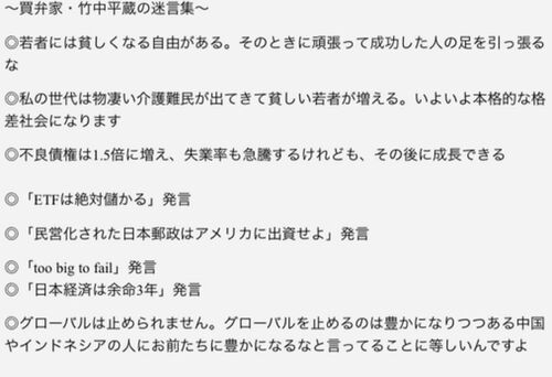 竹中平蔵を政府の要職に起用している自民政権は日本をどん底にさせようとする確信犯です。竹中の過去はブラック過ぎて怖い