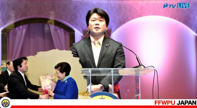 統一教会の式典で来賓あいさつを行い総裁・韓鶴子にカーネーションの花束を渡す防衛副大臣の山本朋広。統一教会は霊感商法などの反社会的行為を行ってきた宗教団体で、国会でも度々取り上げられている。統一教会とここまで密接な議員がよりによって防衛副大臣